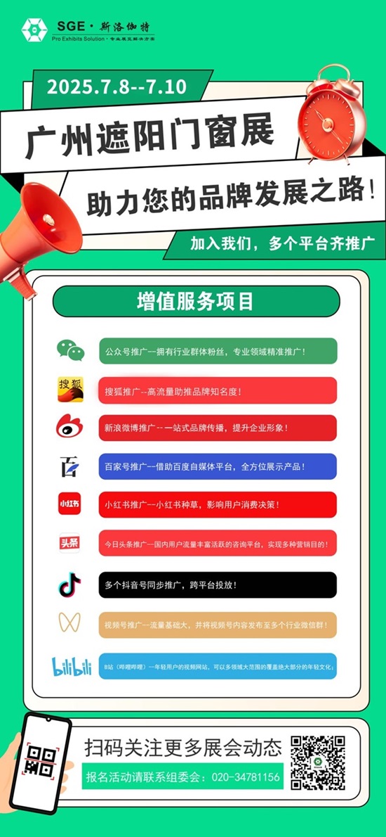 由广州斯洛伽特展览策划有限公司主办的第十五届广州遮阳门窗展览会于2025年7月8-10日在广州国际采购中心隆重拉开帷幕,本届展会将以“智能科技,绿色建筑,节能环保”为主题,专为内外销贸易商量身打造专业的商贸平台。作为建筑材料行业的 “风向标”,为经销商、房地产开发商、工程商、甚至设计师、装饰装修市场、建材市场、门窗市场、建材超市等提供一个最佳的采购平台,也为企业提供一个展新品、推品牌、拓市场、建渠道的最佳良机,以创新之力重塑行业格局,以资源汇聚激活无限商机。